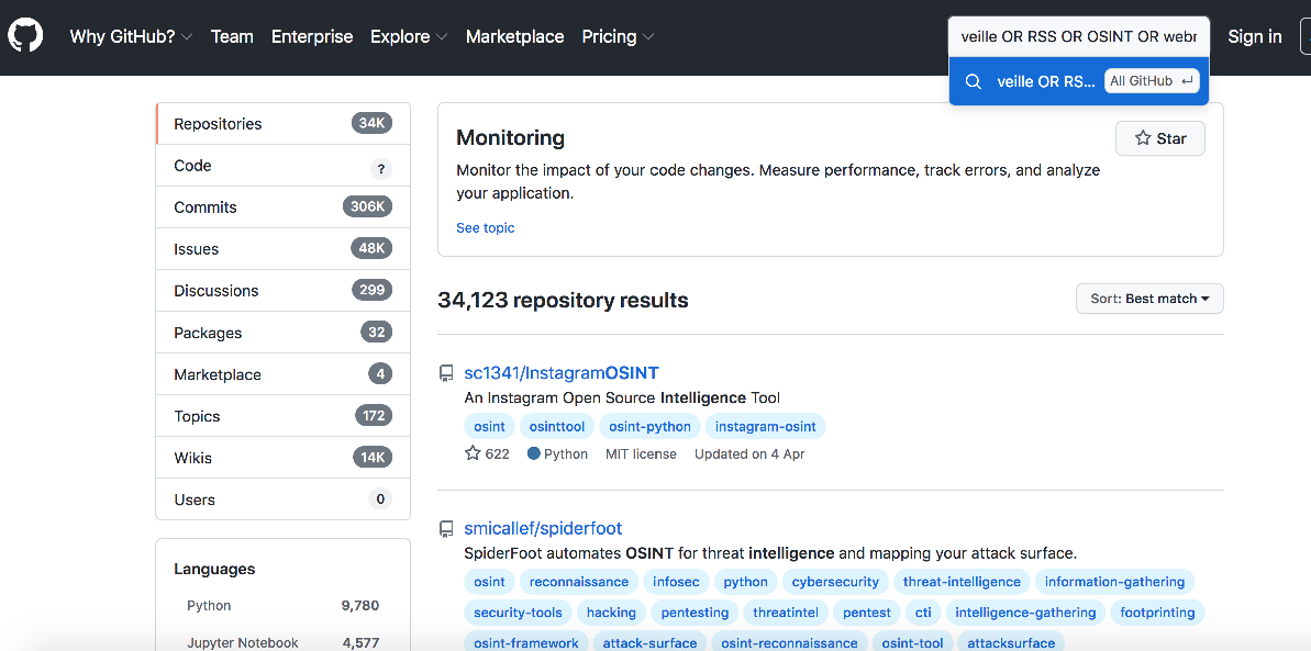 On commencera bien évidemment par interroger directement le moteur disponible dans Github pour essayer de repérer des outils et ressources utiles pour la veille.