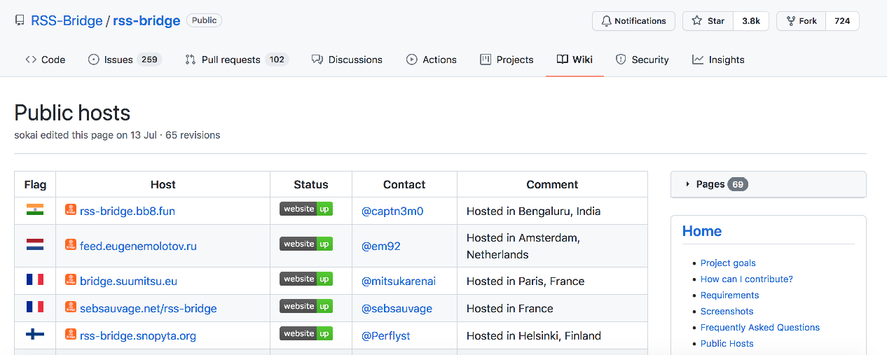 - Il y a aussi des outils qui ne proposent pas de version en ligne, mais qui listent sur Github des versions en ligne de l’outil proposées par des internautes qui ont pris le temps d’installer l’outil sur un serveur et de le mettre à disposition de tous. Là encore, rien de compliqué si ce n’est que cette liste de liens est parfois bien cachée dans Github. Il faudra bien explorer les différentes rubriques d’un « repository » et notamment le wiki (Cf. Figure 2. Instances publiques de RSS Bridge).