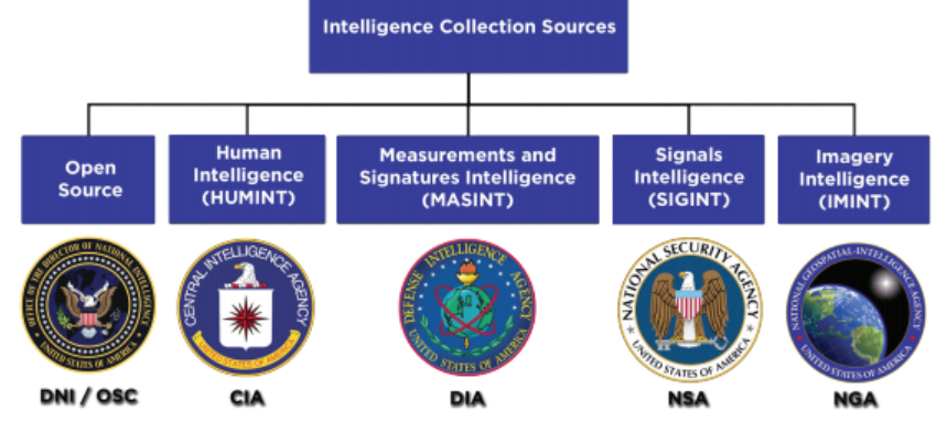 Dans la théorisation qu’en a faite la science du renseignement, l’OSINT, défini plus précisément comme «renseignement provenant d’informations accessibles au public et autres informations non classifiées», est un des maillons d’un ensemble beaucoup plus large de concepts et pratiques. Parmi les principaux : HUMINT (renseignement d’origine humaine collectée par des humains), MASINT (L’intelligence de mesure et signature), SIGINT (interception des transmissions), IMINT (renseignement tiré de l’imagerie).