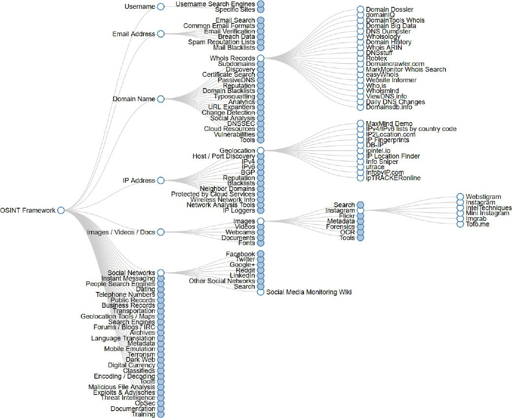 On voit d’ailleurs ci-dessous dans la représentation du «framework OSINT» (voir figure 2), la cohabitation de ces deux dimensions : un ciblage des sources/espaces relatifs à l’exploration sur les personnes, et une très grande diversité de domaines techniques d’exploration sur le web.