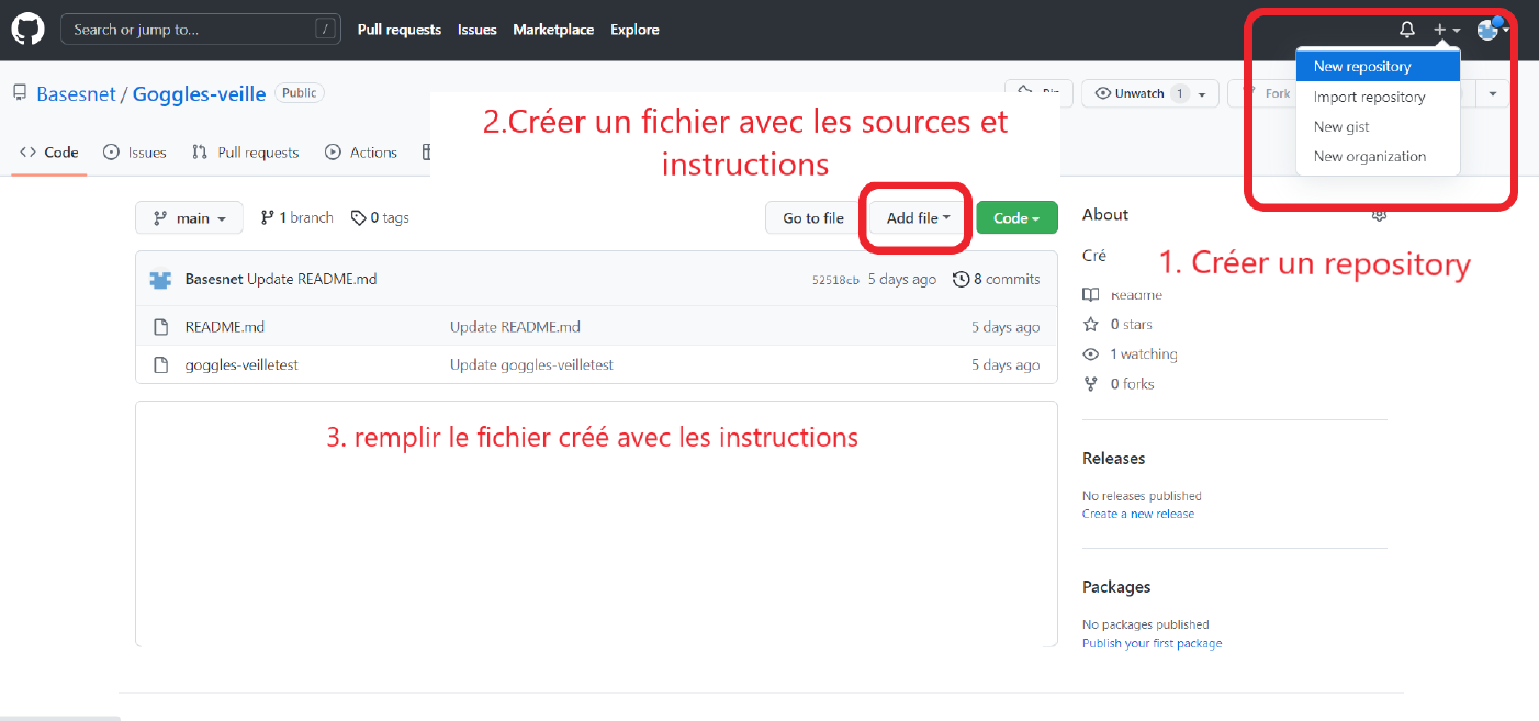 - Une fois le compte créé, on cliquera sur le + en haut à droite et on choisira « New repository », que l’on pourra par exemple appeler « mes Goggles ».