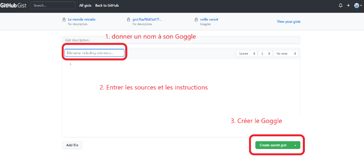 On entrera ses instructions puis on cliquera sur « create a secret gist » (Cf. figure 2. Créer un Goggle sur GithubGist).