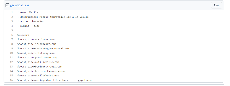 Nous avons par exemple créé un moteur avec des sources liées à la veille et la recherche d’information et notre fichier « Goggles » prend ainsi la forme suivante (Cf. Figure 3. Contenu de notre Goggles sur le thème de la veille et la recherche d’information) :