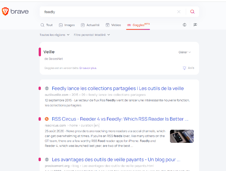 Figure 4. Recherche sur notre moteur personnalisé Veille sur Brave