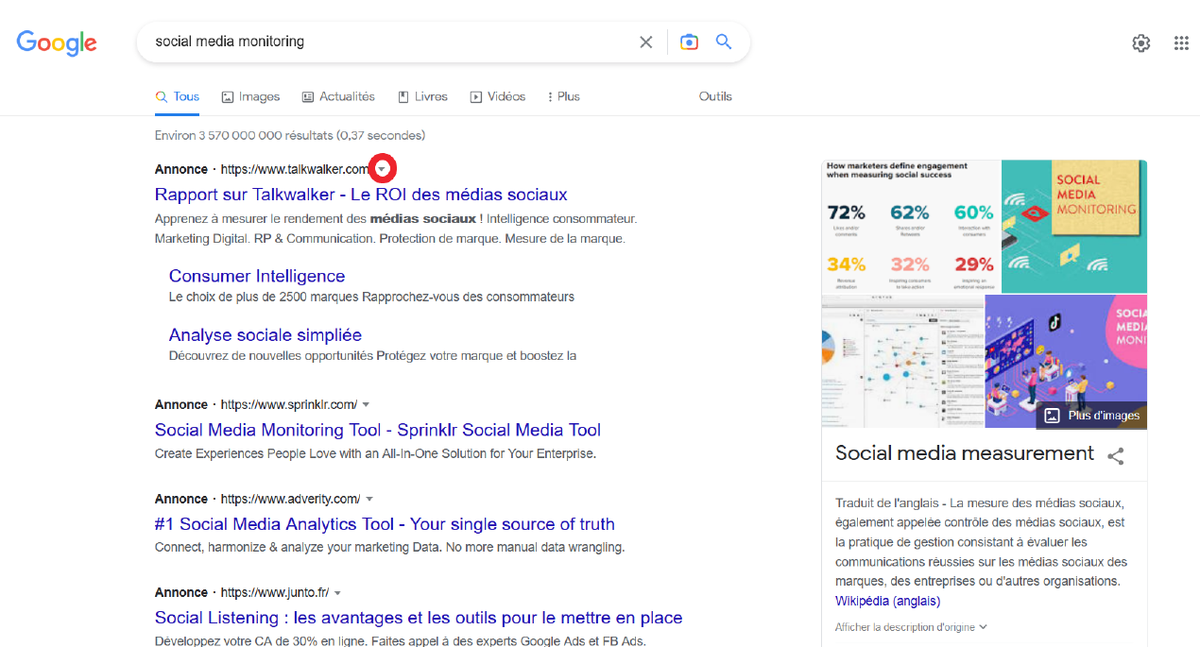 Si on souhaite voir quelles sont les publicités diffusées par des plateformes de social media monitoring par exemple, il faudra donc tenter d’entrer des requêtes susceptibles de faire émerger des résultats sponsorisés.