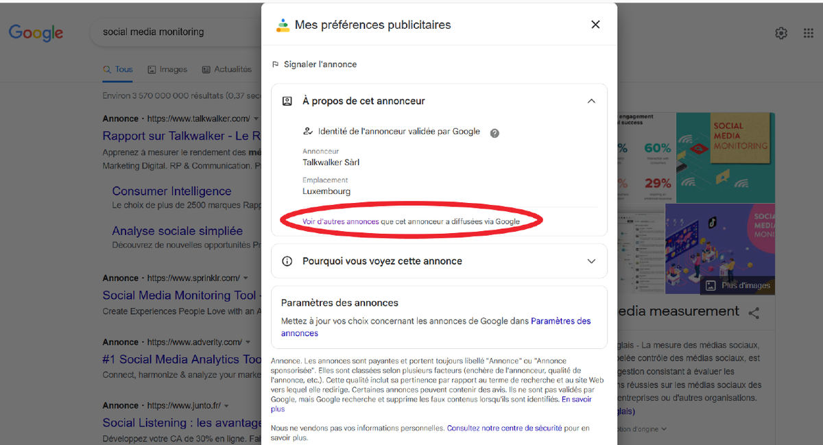 À titre d’exemple, une requête sur social media monitoring fait ressortir plusieurs résultats sponsorisés proposés par des plateformes. Pour visualiser toutes les publicités associées à ces annonceurs, on suivra la méthode suivante :
