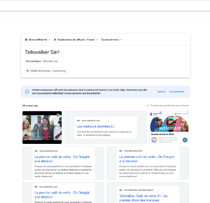 Nos tests ont mis en évidence que pour certains résultats sponsorisés, il reste impossible d’obtenir des informations sur l’annonceur et par conséquent de visualiser ses publicités. C’est par exemple le cas pour d’autres outils de veille comme Digimind, Sindup, Cikisi, Coexel ou encore Visibrain. L’annonceur n’est ici pas officiellement certifié par Google et aucun historique n’est alors disponible. Nous ne savons pas si c’est temporaire et si c’est au libre choix des annonceurs.