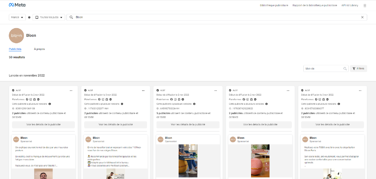 Seul bémol, on a le sentiment de voir moins de publicités que par le passé. Au lancement, on pouvait visualiser un historique assez conséquent pour chaque annonceur et même les publicités inactives, quelle que soit la catégorie de la publicité. Aujourd’hui, il est plus difficile de se faire une idée de l’historique de la stratégie publicitaire d’un concurrent, car seules les publicités actives sont disponibles (à l’exception des publicités à impact sociétal).