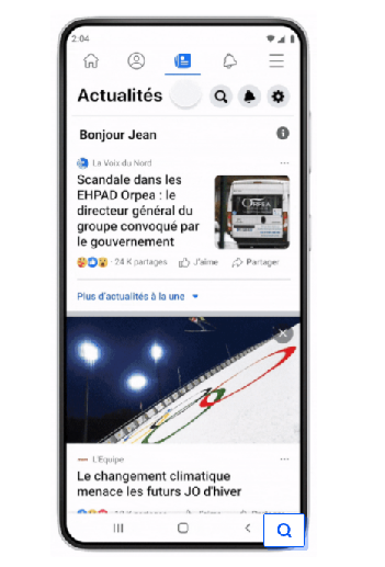 Facebook News c’est avant tout un flux d’information continu, mais il existe tout de même une fonctionnalité de recherche grâce à la petite loupe en haut à droite de l’interface.