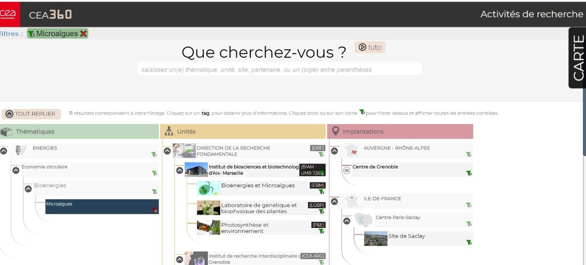 - Unités : sont ici listées les unités qui travaillent sur notre problématique et leur rattachement dans l’organigramme global du CEA. Dans notre cas, on a cinq laboratoires travaillant sur la question des microalgues.