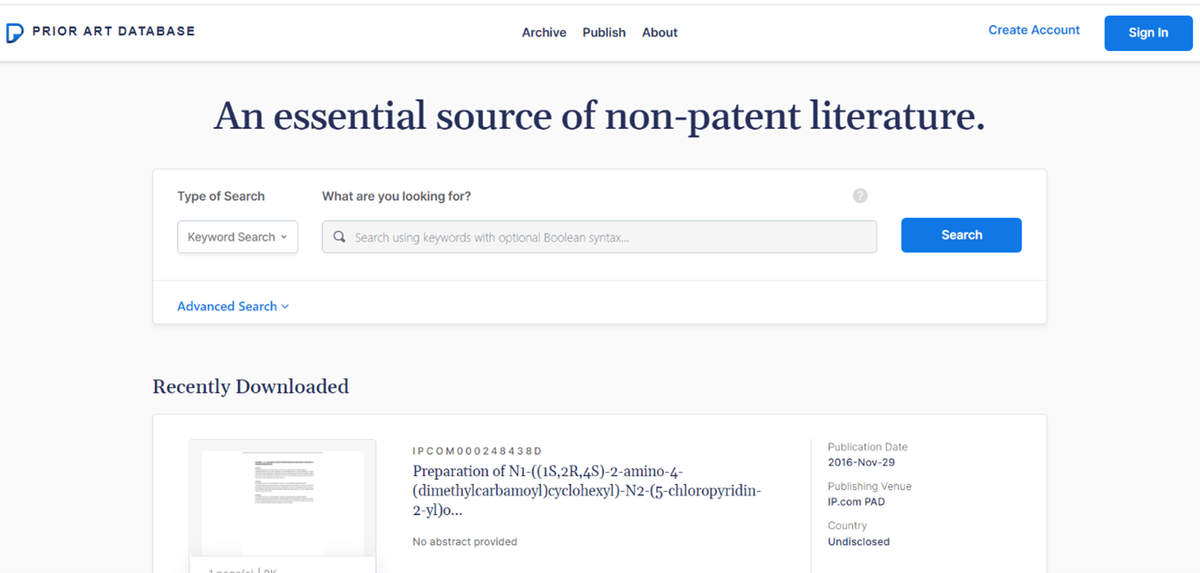 L’une des plus connues, outre Research Disclosure, est IP.com qui se présente comme la plus large (cf. Figure 1. Interface d’IP Prior Art).