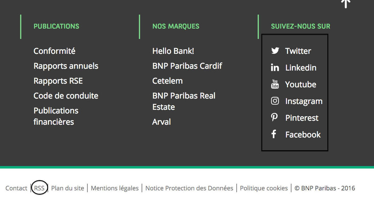 Figure 1. Boutons d’abonnement aux réseaux sociaux et flux RSS sur le site de BNP Paribas
