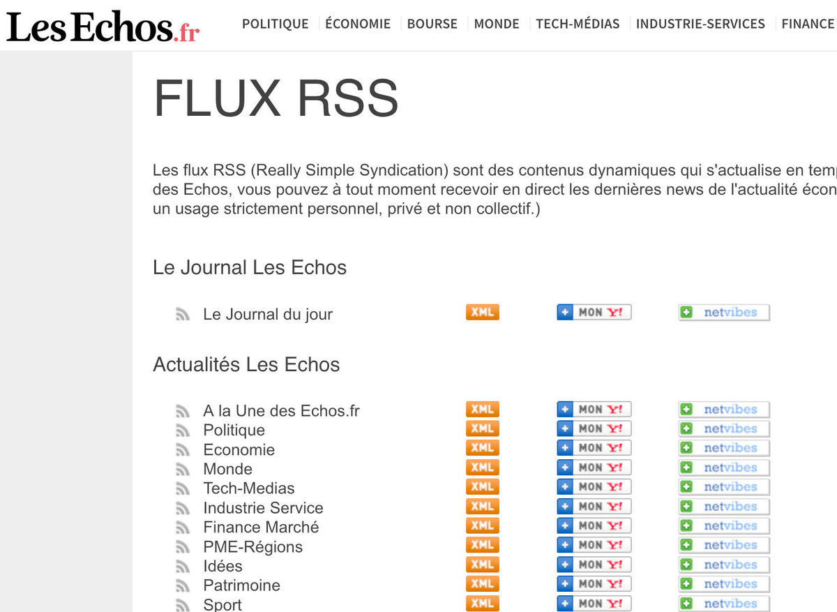 Comme nous le mentionnions plus haut, Les Echos disposent de 49 flux RSS thématiques, ce qui est très utile dans un contexte de veille (voir figure 2.). Le compte Twitter des Echos par contre ne reprend pas l’intégralité des nouveaux articles publiés sur le site mais une sélection seulement.