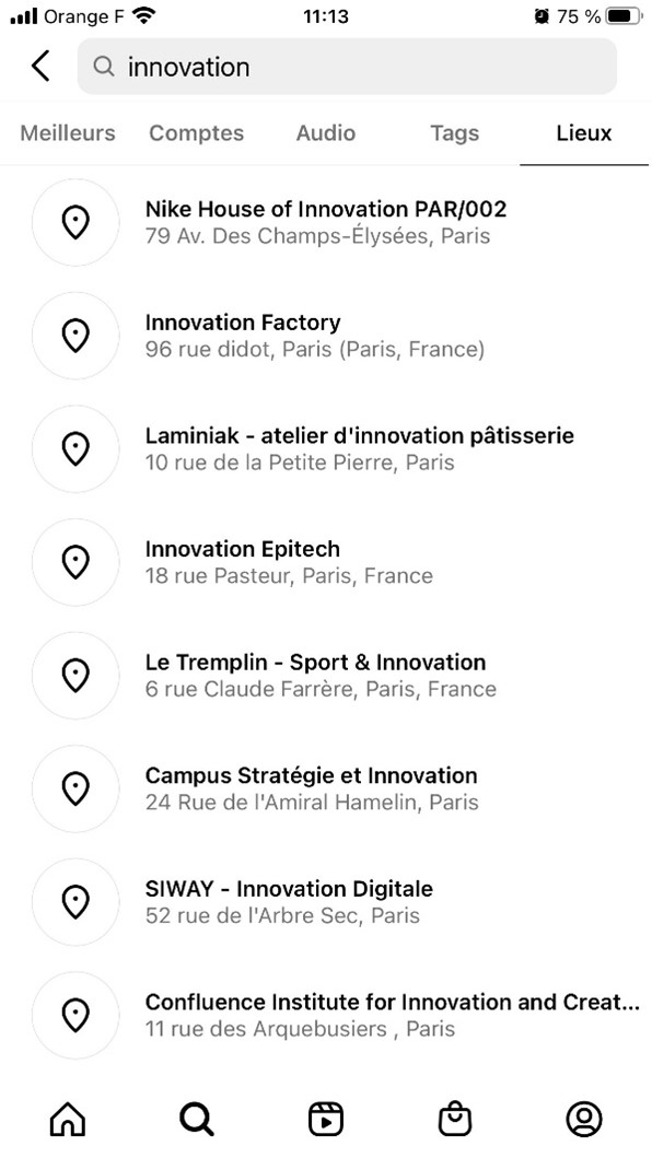 Figure 1. Résultats de recherche Instagram : lieux contenant le mot-clé innovation
