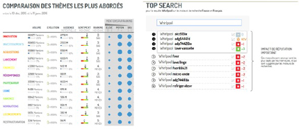 Figure 1: A gauche, tableau représentant la comparaison des thèmes les plus abordés. A droite, une représentation du module Top Réputation. La requête s’intéressait ici à la visibilité digitale de Whirlpool.